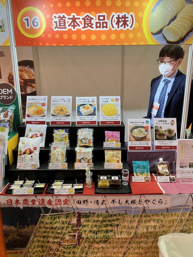 道本食品は、「スーパーマーケットトレードショー」展示会に出展しています。日本最大級の食品流通・小売業向けの商談を行う商談展示会です。当社は宮崎県の企業として、天日干したくあん・切り干し大根・冷や汁など宮崎の素材を生かした商品をご紹介しております。ご来場予定の皆様は、道本食品ブースへお立ち寄りください。